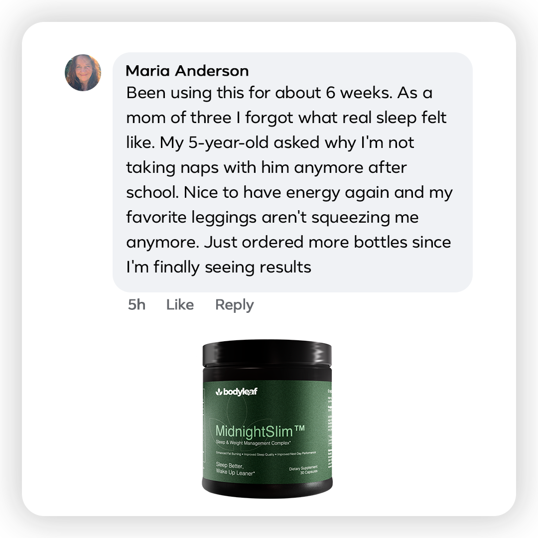 "After my second child, I struggled with baby weight. MidnightSlim™ helped me with my midsection, boosted my energy, and improved my sleep and digestion. I don’t crave snacks like I used to!"
